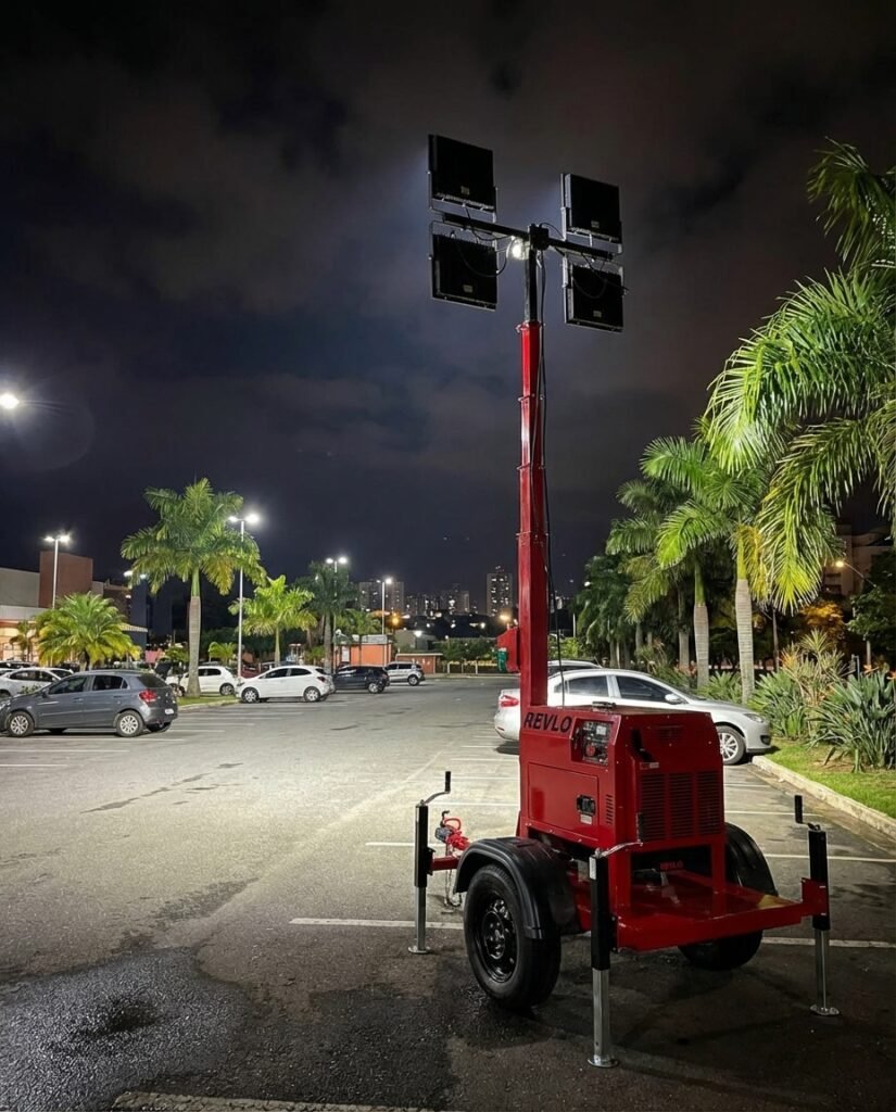 É um equipamento usado para iluminar grandes áreas externas, como obras e eventos, com energia gerada por motor a diesel.